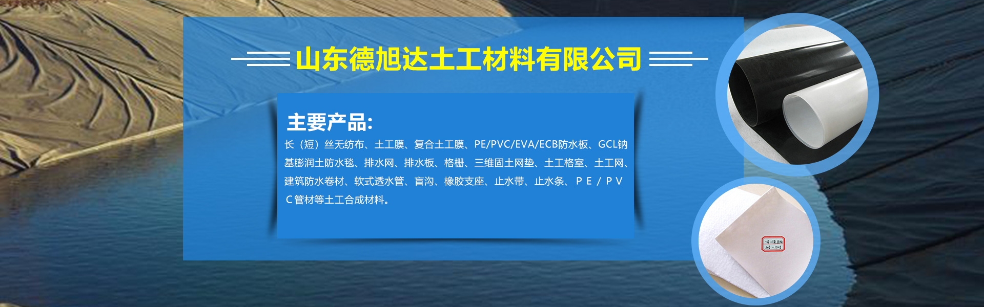 聚酯長絲土工布、滌綸短絲無紡?fù)凉げ肌?fù)合土工膜、防滲土工布、HDPE土工膜(防滲膜)等產(chǎn)品